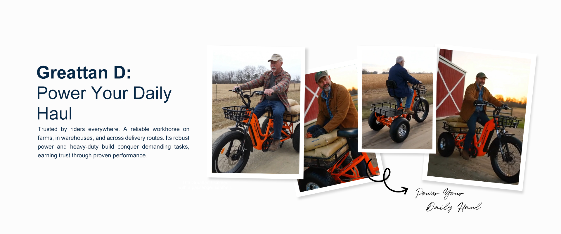 The Greattan D elevates this capability even further. Its long‑range dual‑battery system eliminates mid‑shift charging, while the 500‑lb payload capacity supports high‑volume parcel loads throughout the day. Delivery riders benefit from the stable three‑wheel platform, which allows rapid loading and unloading without balancing concerns—critical during frequent stop‑and‑go operations. This makes the Greattan D especially valuable for food‑delivery services and courier/express logistics, where fast turnaround, high payload capacity, and all‑day reliability directly impact delivery efficiency and customer satisfaction.